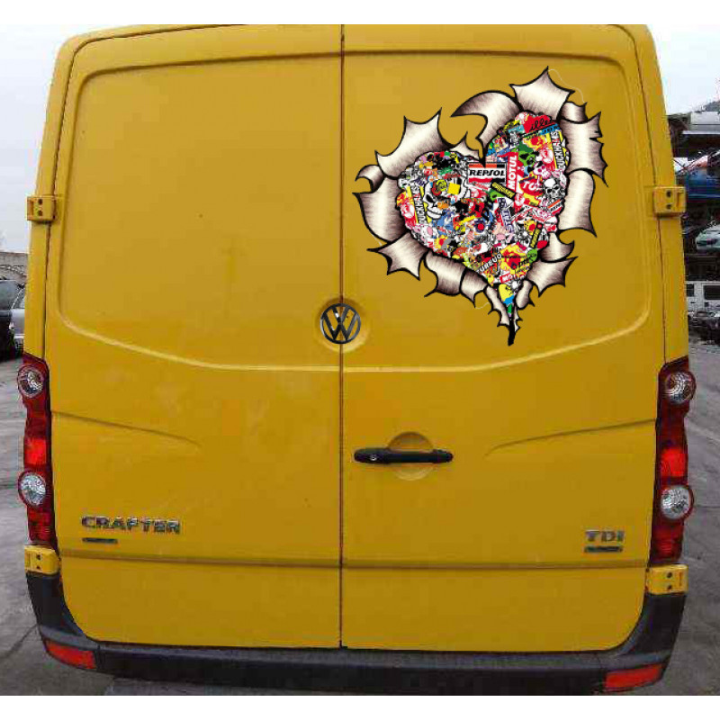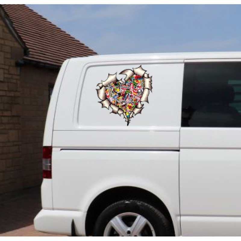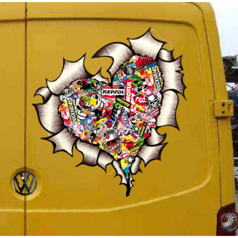 A torn metal decal in a heart shape showing a stickerbomb interior